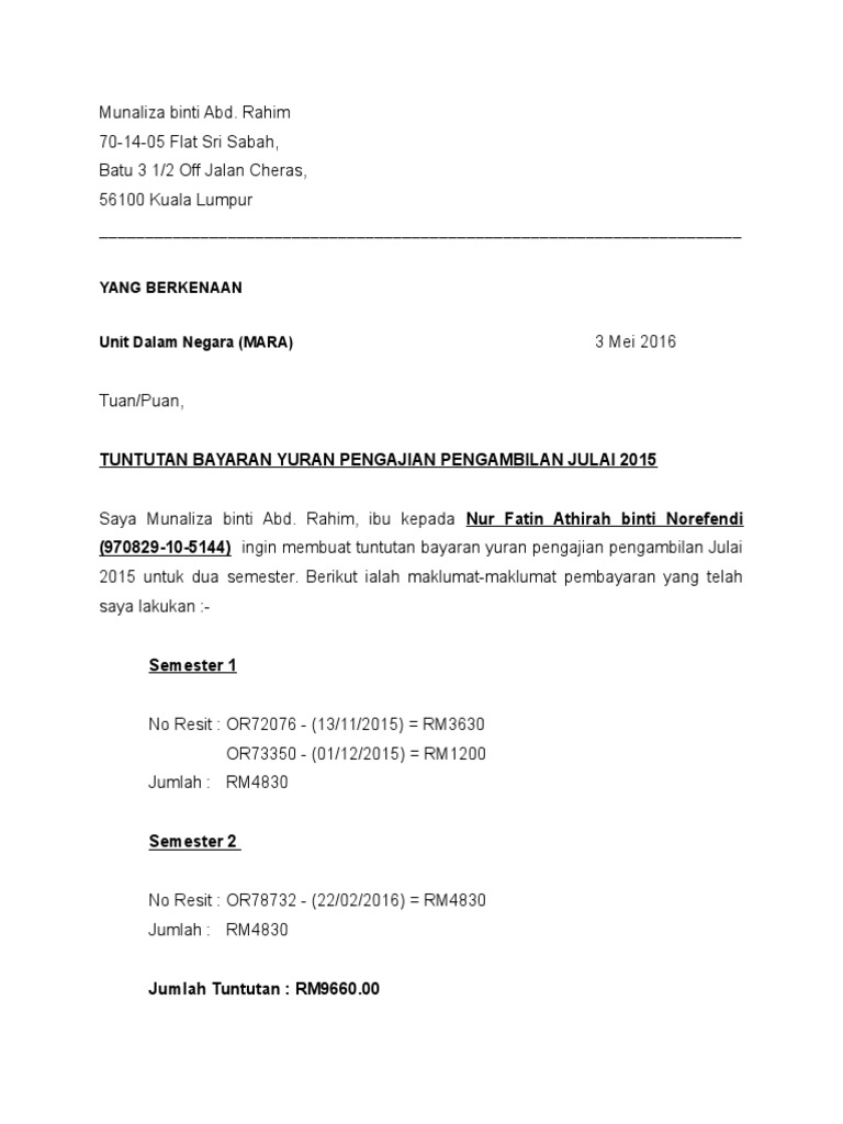 Format surat permohonan dari pemohon untuk tuntutan bayaran balik hasil ke janm tawau. Berikut ini 3 contoh surat tuntutan ganti rugi yang bisa kamu pakai saat terjadi sengketa. Mohamad syafiq razalie bin mohd lazim no.